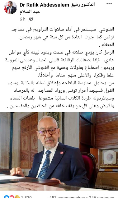 تداول نشطاء في مواقع التواصل الاجتماعي فيسبوك و صفحات رسمية الليلة تدوينة لصهر راشد الغنوشي الهارب بالخارج يهاجم فيها بعض من شعب تونسي بخصوص طرد راشد الغنوشي من المساجد :