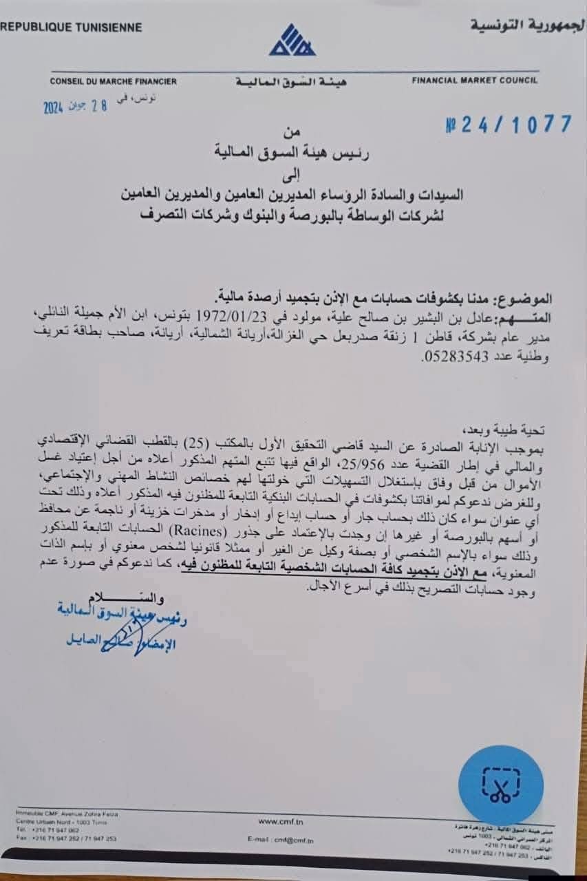 وبحسب ما ورد في التدوينة المتداولة، فإن لجنة التحاليل المالية كانت قد اتخذت، في التاريخ المذكور، قرارًا يقضي بتجميد الحسابات البنكية للرئيس المدير العام لبنك الزيتونة، عادل بن علية، وذلك على خلفية ما وُصف بـ«شبهات ثابتة تتعلق بعمليات غسيل أموال».