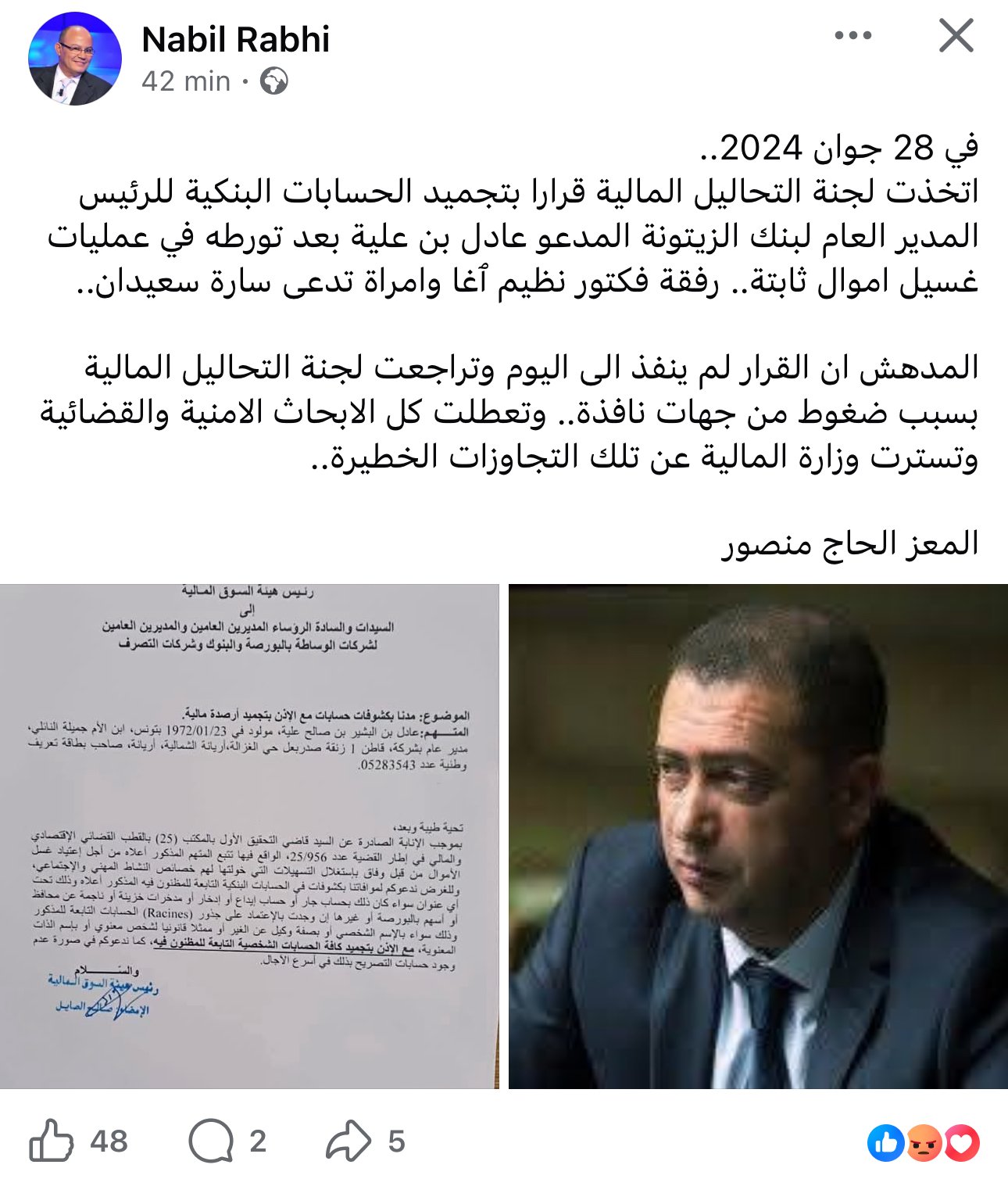 وبحسب ما ورد في التدوينة المتداولة، فإن لجنة التحاليل المالية كانت قد اتخذت، في التاريخ المذكور، قرارًا يقضي بتجميد الحسابات البنكية للرئيس المدير العام لبنك الزيتونة، عادل بن علية، وذلك على خلفية ما وُصف بـ«شبهات ثابتة تتعلق بعمليات غسيل أموال».