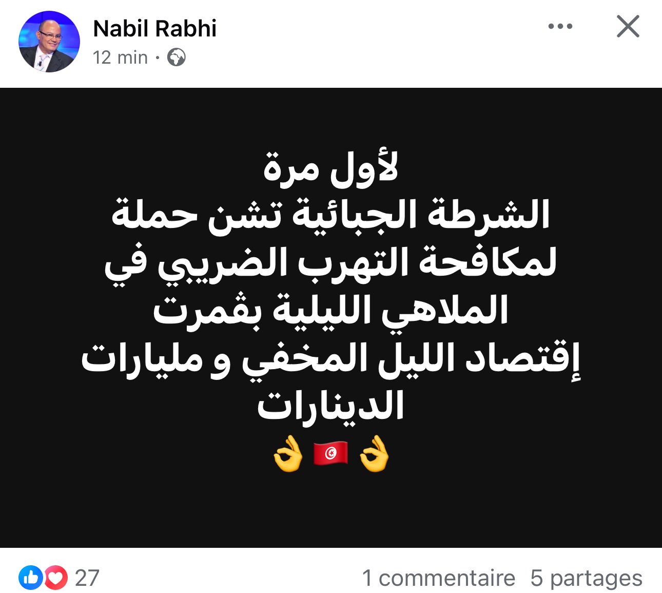أكد الناشط السياسي المعروف نبيل الرابحي في تدوينة على صفحته الرسمية على فيسبوك اليوم، أن الشرطة الجبائية شرعت في حملة واسعة لمراقبة الملاهي الليلية بڨمرت، بهدف مكافحة التهرب الضريبي وتعزيز الشفافية في القطاع الترفيهي.