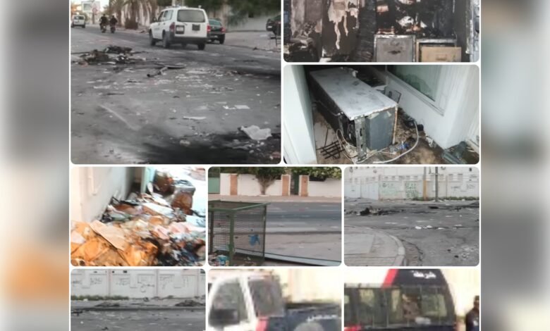 وشهدت المدينة ليلة من الفوضى، حيث قام مجهولون بأعمال تخريب وحرق استهدفت مؤسسات عمومية وتربوية. وأظهرت المشاهد المصورة دمارًا كبيرًا لحق بإحدى الإدارات التابعة للمجمع الكيميائي، حيث تم إحراق الأرشيف بالكامل. كما طال التخريب معهد حي المنارة، مما أثار استياء الأهالي الذين أكدوا أن هذه الأعمال لا تمثلهم وأنها من فعل “أطراف مندسة” تهدف إلى “تأجيج الوضع” وتسييس القضية.