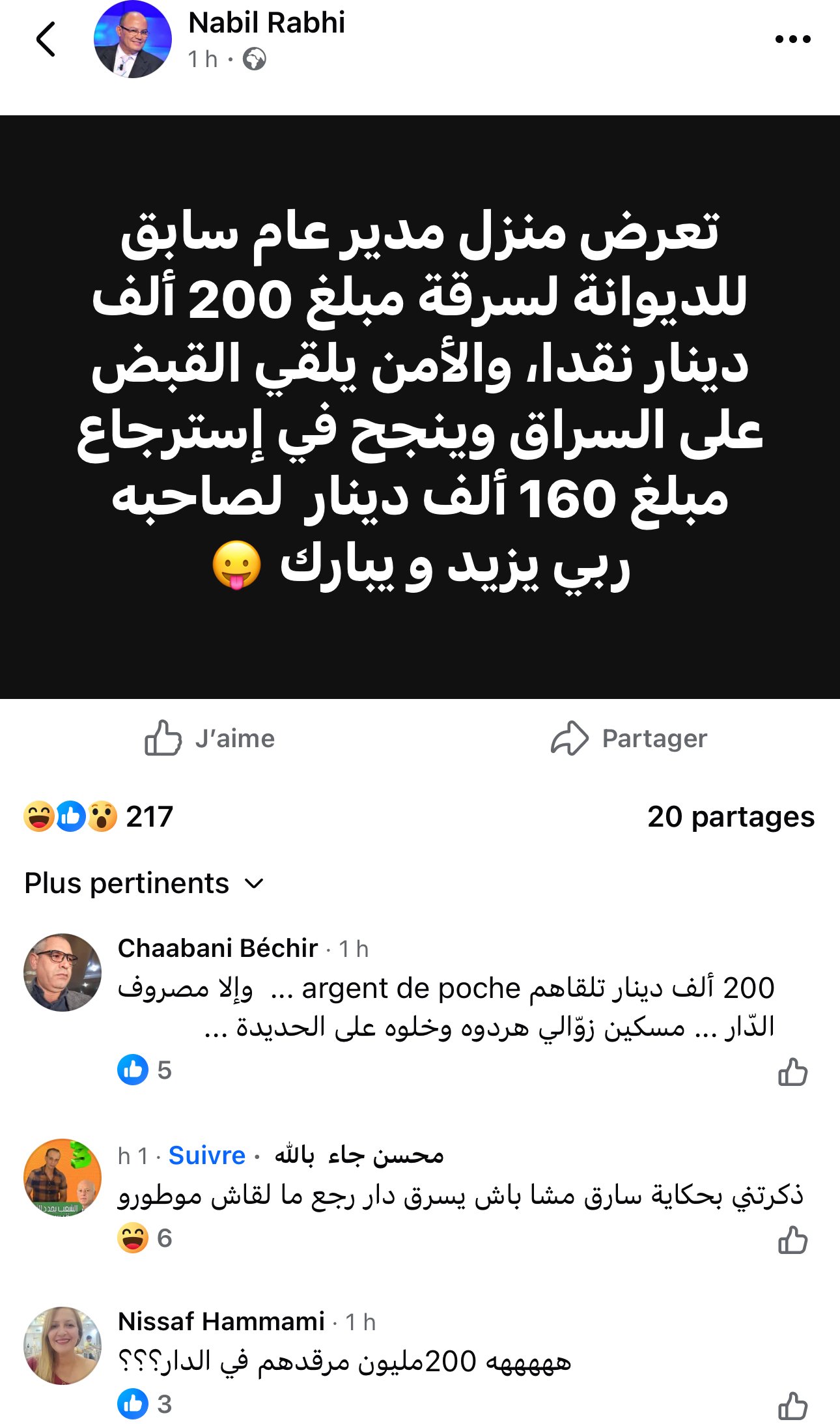 أثار الناشط السياسي نبيل الرابحي، عبر تدوينة نشرها على صفحته الرسمية بموقع فيسبوك، قضية رأي عام جديدة، كاشفًا عن تعرض منزل مدير عام سابق للديوانة التونسية لعملية سرقة لمبلغ مالي ضخم يُقدر بـ 200 ألف دينار تونسي نقدًا. وفي تطور سريع، أكد الرابحي أن الوحدات الأمنية تمكنت من فك لغز الجريمة وإلقاء القبض على المتورطين.
