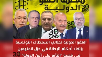 العفو الدولية: تطالب السلطات التونسية إلغاء أحكام الإدانة في حق المتهمين في قضية “التآمر على أمن الدولة” والإفراج عنهم فور دون قيد أو شرط.