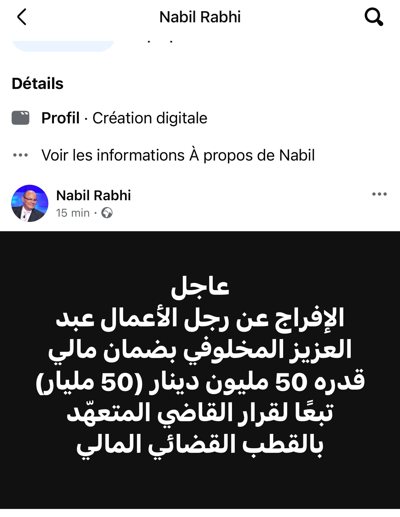 أكد الناشط السياسي المعروف، نبيل الرابحي، منذ قليل، في تدوينة مقتضبة على صفحته الرسمية على موقع “فيسبوك”، نبأً يُعتبر تطوراً هاماً في أحد الملفات القضائية الحساسة. وأشار الرابحي إلى الإفراج عن رجل الأعمال عبد العزيز المخلوفي.
