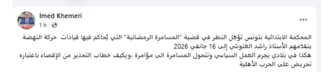 قررت الدائرة الجنائية بالمحكمة الابتدائية بتونس تأجيل النظر في القضية المتعلّقة برئيس حركة النهضة راشد الغنوشي وعدد من قيادات الحركة إلى يوم 16 جانفي 2026، وذلك في ما يُعرف إعلاميًا بـ”قضية المسامرة الرمضانية”، وفق ما أكده القيادي بالحركة عماد الخميري.