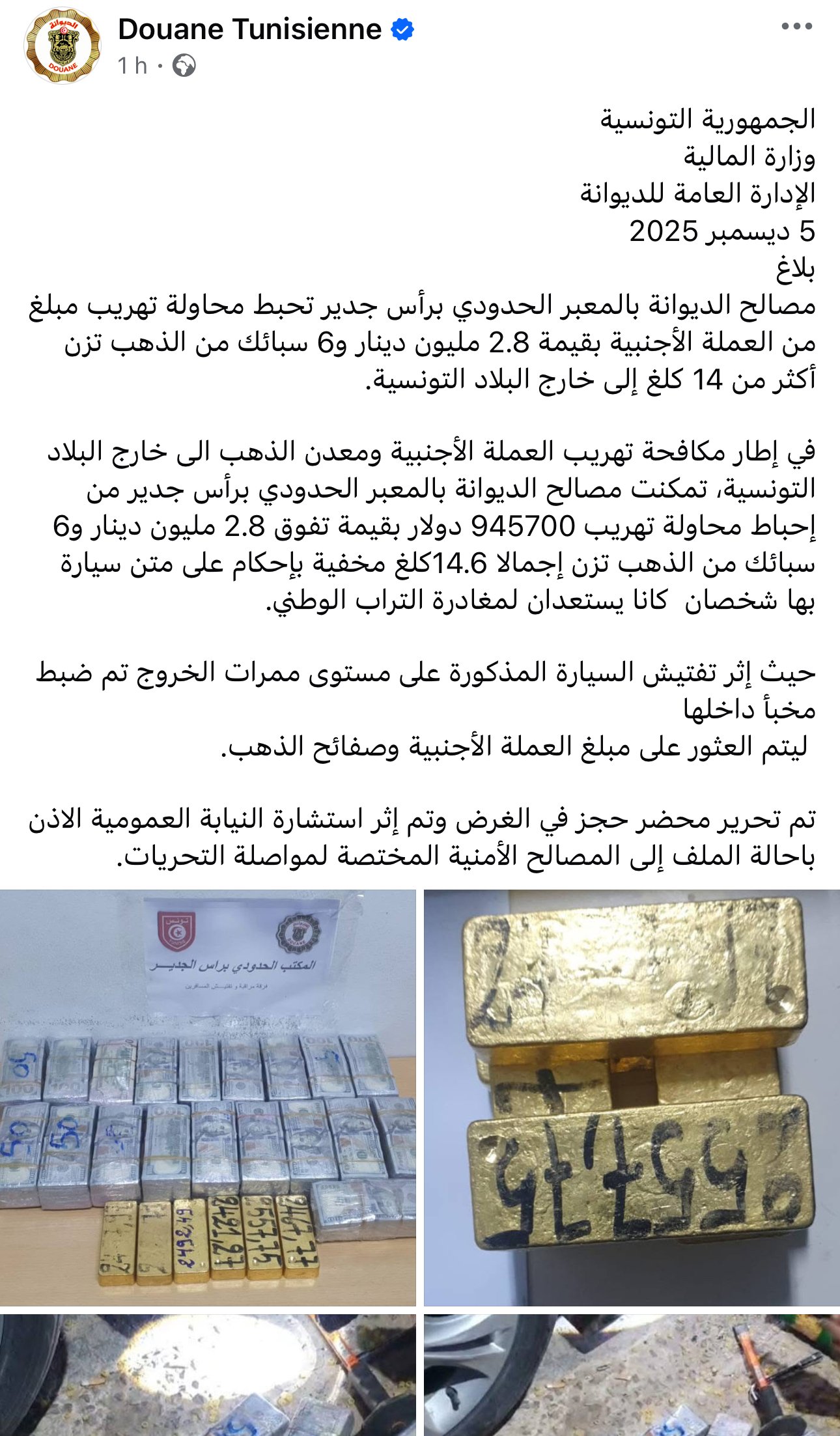 وأوضحت الديوانة التونسية أنّ عملية التفتيش الدقيق التي قامت بها فرقها على مستوى ممرات الخروج بالمعبر مكّنت من الكشف عن مخبأ خاص داخل السيارة، وهو ما أدى إلى العثور على المبلغ المالي الكبير وصفائح الذهب التي كانت موجهة للتهريب خارج التراب الوطني.