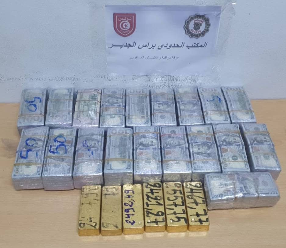 أعلنت مصالح الديوانة بالمعبر الحدودي برأس جدير عن نجاحها في إحباط محاولة تهريب مبلغ مالي ضخم يقدّر بـ 945700 دولار، أي ما يعادل أكثر من 2.8 مليون دينار تونسي، إضافة إلى 6 سبائك من الذهب يبلغ وزنها الجملي 14.6 كلغ.
